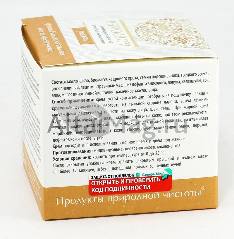 Крем косметический «Ореховый» серии «Добродея» - натуральный крем на основе биомассы кедрового ореха, семян подсолнечника, грецкого ореха, травяных масел из лофанта анисового, лопуха, календулы, сока алоэ, масла виноградной косточки, каменного масла. Крем не содержит синтетических компонентов, эмульгаторов, консервантов.